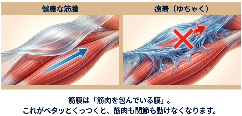 筋膜は『筋肉を包んでいる』ので、筋膜同士がくっ付いて癒着すると、中にある筋肉も動けなくなります。